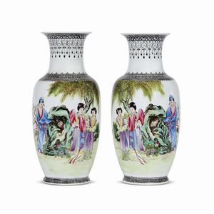 COPPIA DI VASI, DINASTIA QING, SEC.XIX-XX in porcellana policroma raffigurante figure femminili in un momento [..]