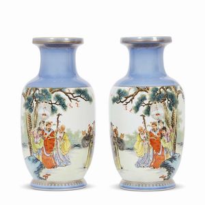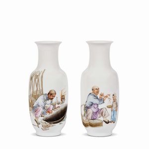 COPPIA VASI, CINA, PERIODO DELLA REPUBBLICA (1912-1949) in porcellana policroma a forma rotolo dipinto con personaggi [..]