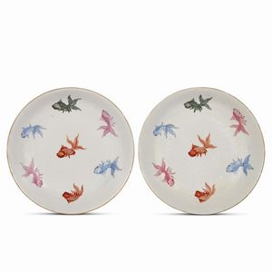 DUE PIATTI, CINA, PERIODO DELLA REPUBBLICA (1912-1949) in porcellana bianca, raffigurazione di sette pesci colorati. [..]