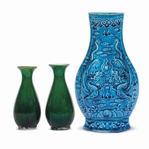 TRE VASI, CINA, DINASTIA QING, SEC.XIX due vasi sono in porcellana verde a forma di Guanyinping e un vaso in [..]