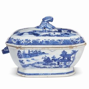 ZUPPIERA, CINA, DINASTIA QING, SEC.XVIII in porcellana bianco e blu, decorata con paesaggi e vari personaggi. [..]