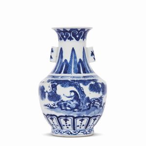VASO, CINA, DINASTIA QING, SEC.XIX-XX in porcellana bianco e blu di forma Hu con anse a forma di bambù, [..]
