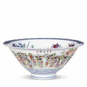 CIOTOLA, CINA, SEC.XX in porcellana Wucai raffigurante cento personaggi femminili e decorazione floreale sul bordo. [..]