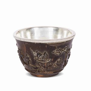 CIOTOLA, CINA, DINASTIA QING, SEC.XVIII in stagno e cocco intagliato con personaggi su fiume. Alt.cm 3,3 清 [..]