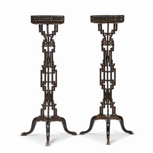COPPIA DI PIEDISTALLI CHIPPENDALE CINESI, CINA, DINASTA QING, SEC.XIX in legno laccato in nero a forma del modulo [..]