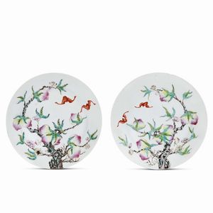 COPPIA DI PIATTI, CINA, DINASTIA QING, SEC.XIX in porcellana policroma, decorati con rami di pesco e pipistrelli [..]