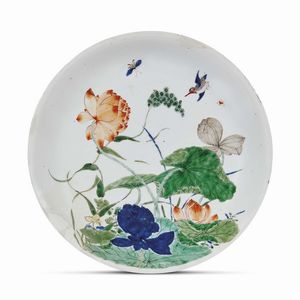 PIATTO, CINA, DINASTIA QING, SEC.XVIII in porcellana policroma della famiglia verde, raffigurante fiori di loto, [..]