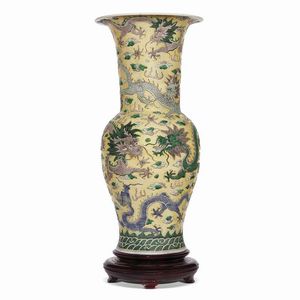 VASO, CINA, DINASTIA QING, SEC.XIX in porcellana Sancai a forma di YanYan raffigurante draghi che volano immersi [..]