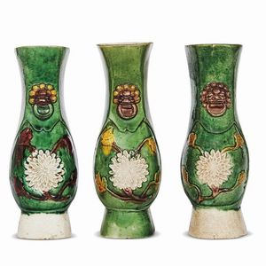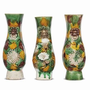 TRE VASI DA MURO, CINA, DINASTIA QING, SEC.XVIII da muro in biscuit Sancai, con decorazione di rami floreali e [..]