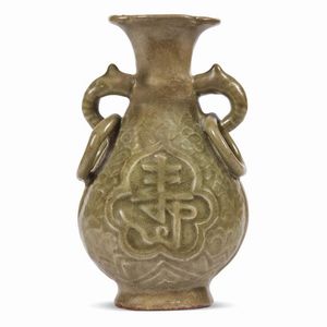VASO, CINA, DINASTIA QING, SEC.XVII in porcellana celadon Longquan, anse con anelli decorati con calligrafia Shou [..]