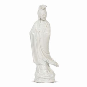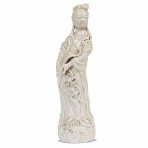 STATUA, CINA, DINASTIA QING, SEC.XX in porcellana bianca raffigurante Guanyin. Il personaggio si trova su una [..]