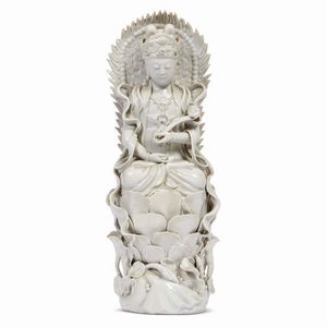 SCULTURA, CINA, DINASTIA QING, SEC.XIX in porcellana bianca Dehua raffigurante Guanyin seduto su base di loto. [..]