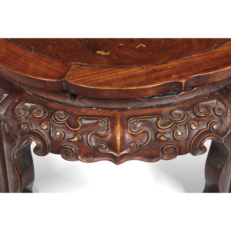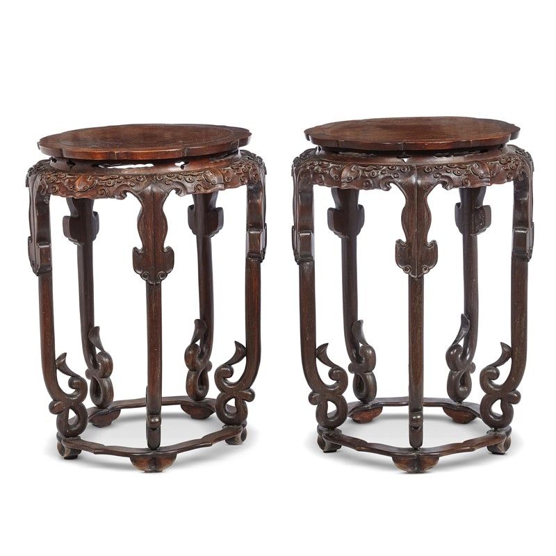 COPPIA DI SUPPORTI, CINA, DINASTIA QING, SEC.XVIII in legno Huanghuali a forma di tamburo a cinque piedi. Decorato con modulo Taotie ai cinque lati. Il bordo superiore è a forma di fiore. Alt.cm 51,9 清 十八世纪 黄花梨木饕餮卷草纹花几一对 高51,9厘米