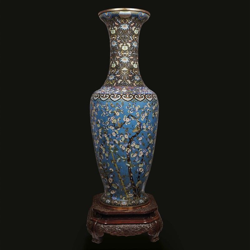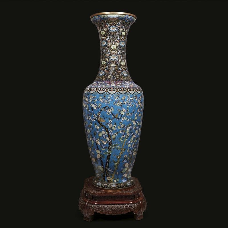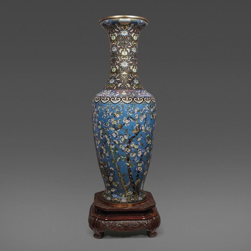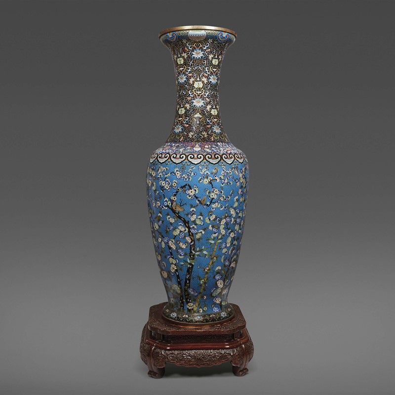 in cloisonné a forma di YanYan, il collo lungo elegante, la scivolata sulle spalle, l'addome lungo, il tamburo leggermente, il piede a cerchio corto. La parete addominale è decorata con grotte in filigrana, crisantemi e fiori di prugna sul fondo della svastica, con farfalle e uccelli all'interno che significa "longevità". Decorato con motivi di fiori e uccelli con la svastica, il motivo Fushou e lo smalto blu cielo più profondo, al collo con fondo nero, si può determinare che questa coppia di bottiglie di visualizzazione sia stata realizzata dalla manifattura Decheng di Pecchino durante il periodo Daoguang o Xianfeng della dinastia Qing.