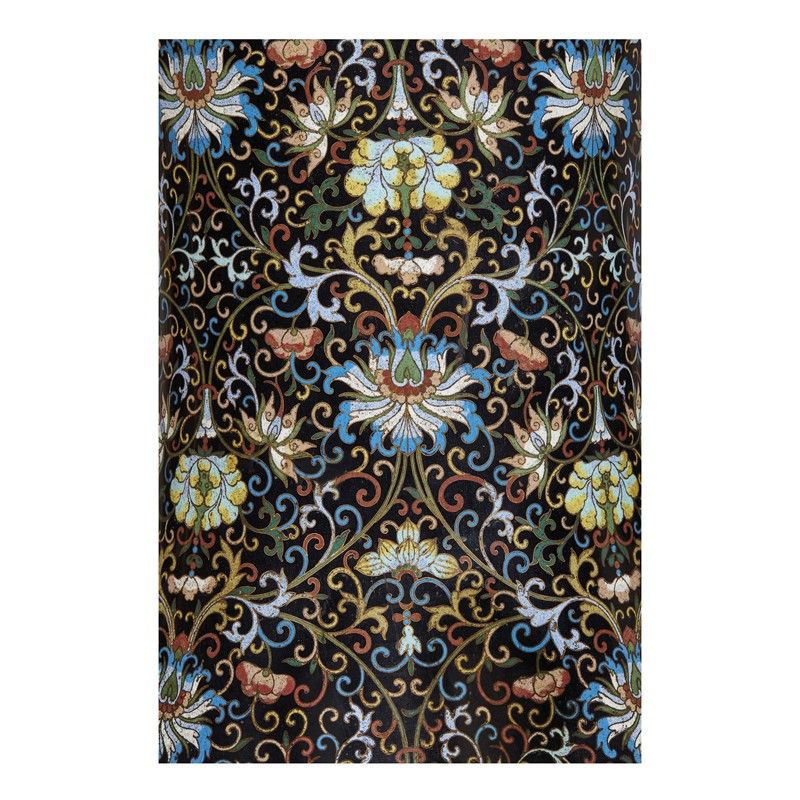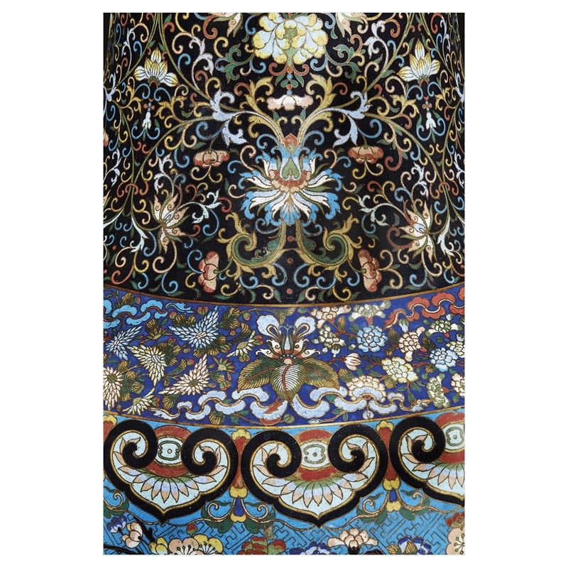 撇口、长颈俊逸、溜折肩、长腹微鼓。 颈部黑地缠饰缠枝莲纹、如意云纹、肩部宝蓝地饰八宝纹,腹为蓝地卐字掐丝底饰、上饰有蝶、鸟、竹、菊、梅、芙蓉,此对凤尾尊寓意“长寿绵延”。