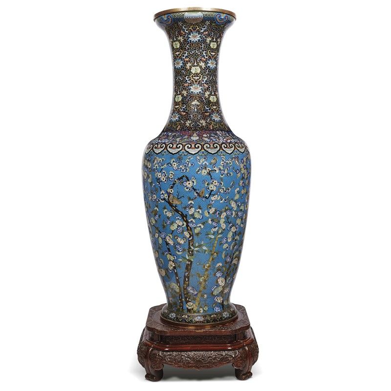 清 十九世纪 铜胎掐丝珐琅蓝地四季花鸟缠枝莲八宝寿纹凤尾尊一对 形制系出京城德成 但无款印 净高152,2厘米 木底座高25,5厘米