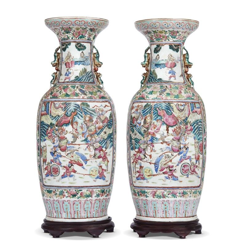 清 十九至二十世纪 广彩刀马人物古诗文双耳尊一对 高63,5厘米
