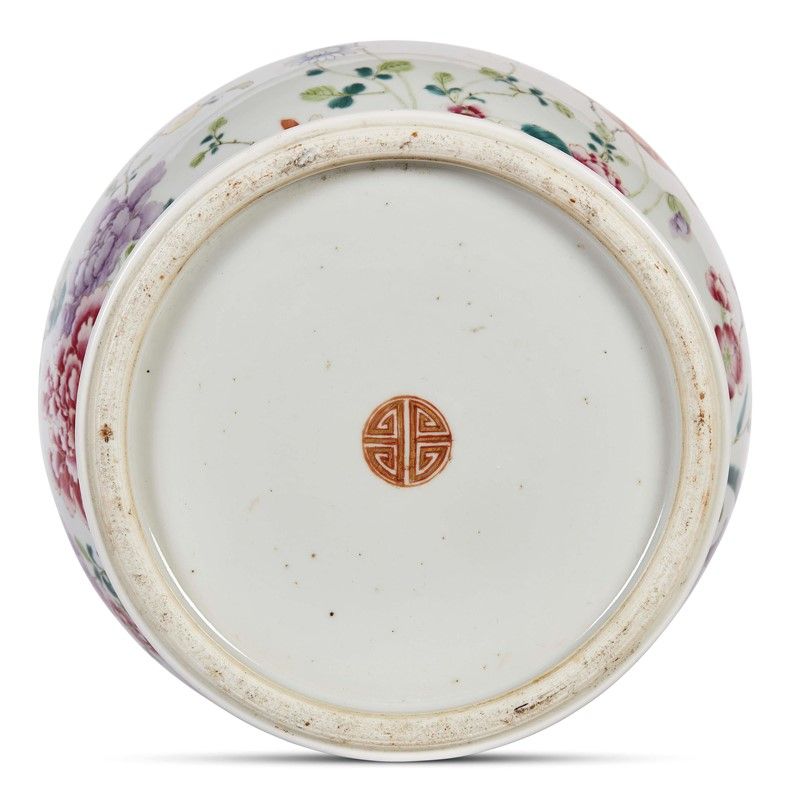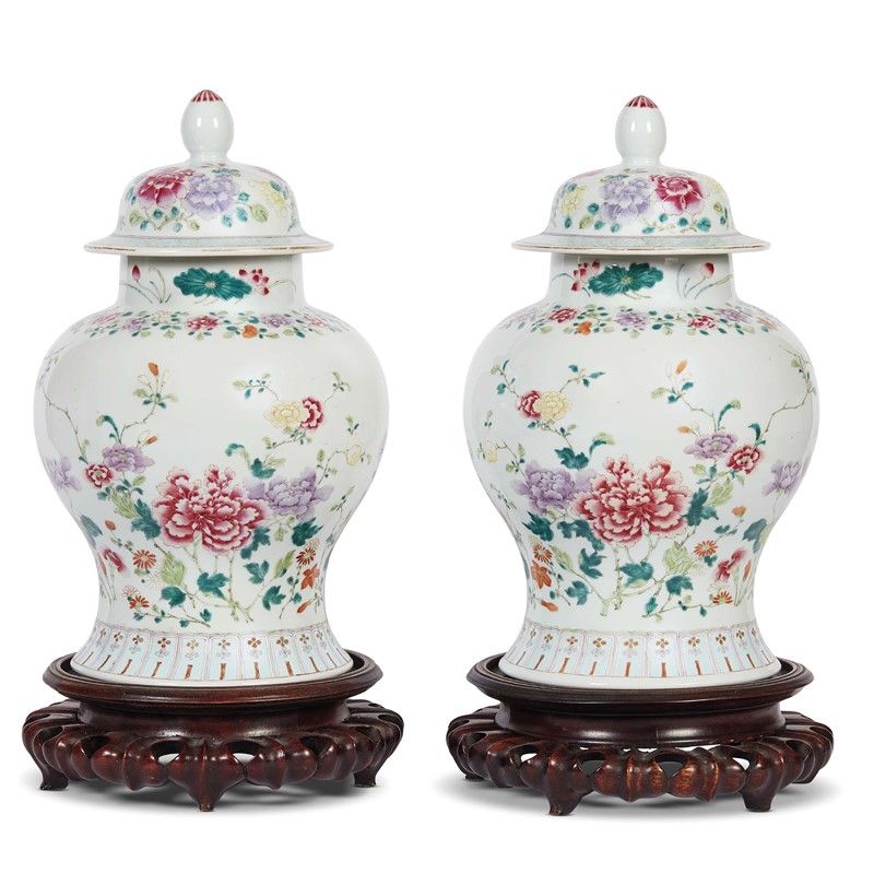 dotati di coperchi in porcellana policroma, decorati con i fiori più importanti della Cina. Il manico del coperchio è a forma di loto chiuso e sul collo sono presenti foglie e fiori di loto. Sulla spalla è presente un modulo di rose a rami continui e decorazione floreale sulla pancia. Il piede è stato decorato con petali stilizzati.