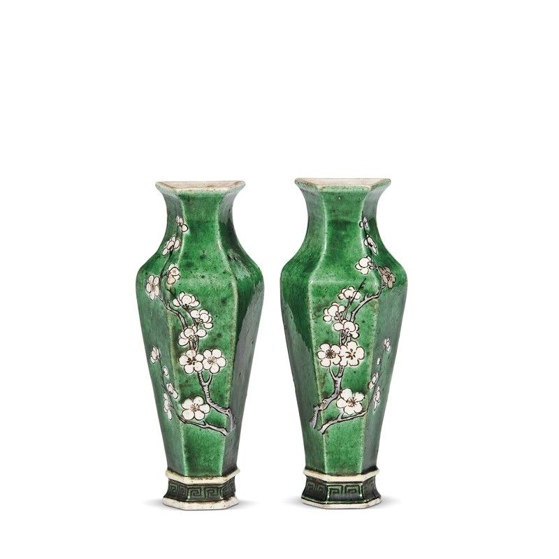 清 十八世纪 绿地素三彩梅纹壁瓶一对 高10,5厘米