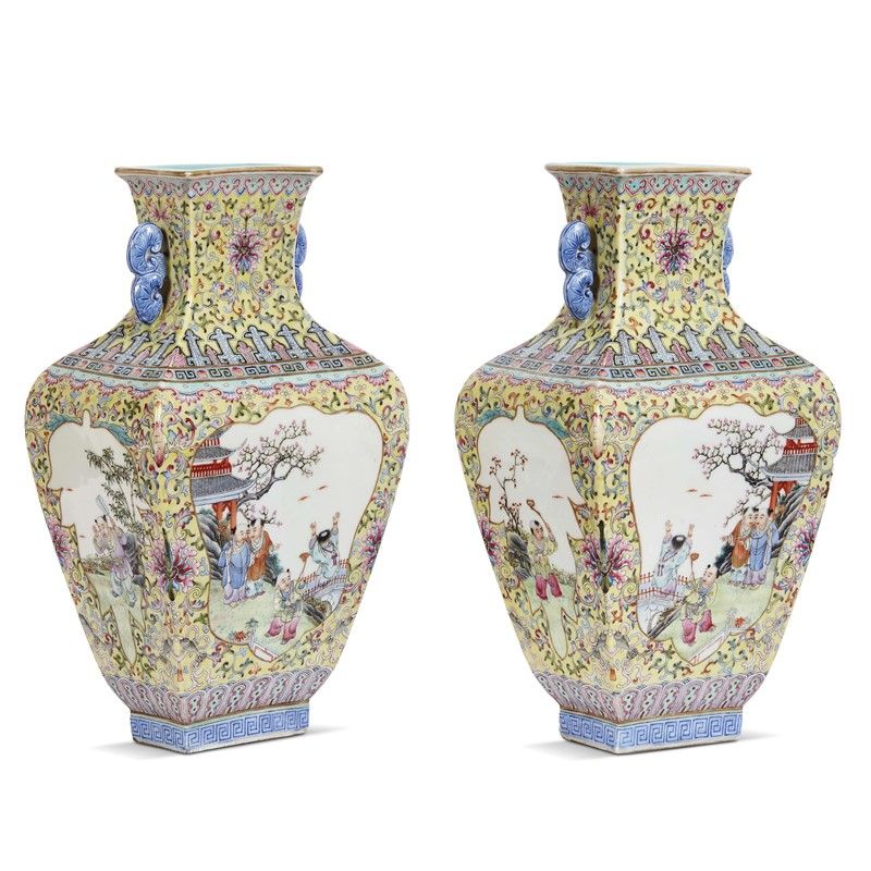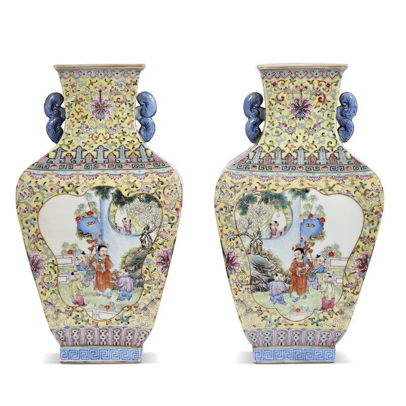 COPPIA DI VASI, CINA, PERIODO DELLA REPUBBLICA (1912-1949) in porcellana famiglia gialla a forma squadrata, dipinti con bambini entro riserve con due anse a forma di funghi Lingzhi. Alt.cm 45 民国 1912至1949 珐琅彩淡黄地开光婴戏图灵芝耳方尊一对 高45厘米