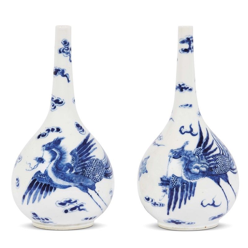 DUE VASI, CINA, DINASTIA QING, SEC.XVIII in porcellana bianco e blu a forma di Zhuiping raffigurante una fenice in volo e nuvole stilizzate. Le Fenici trasportano un tesoro con il becco. Reca marchio Neifu sotto la base. Alt.cm 19,5 清 十八世纪 青花凤纹锥把胆式瓶一组两件 内府款 高19,5厘米