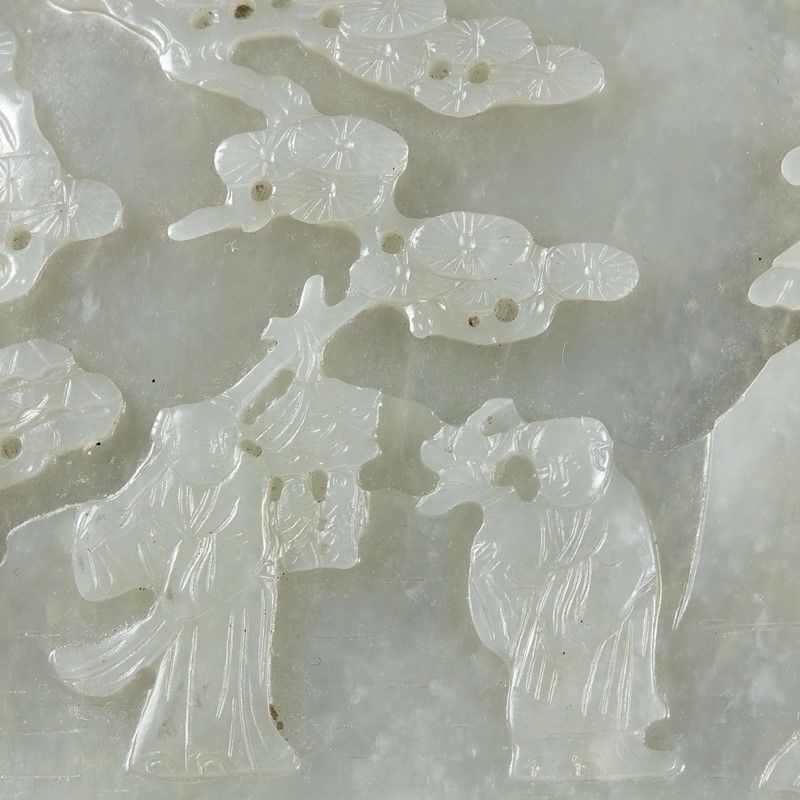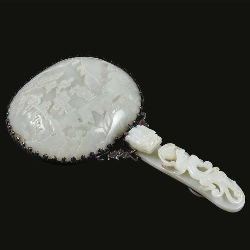 FIBBIA ED INTAGLIO MONTATI SU STRUTTURA IN SPECCHIO, CINA, DINASTIA QING, SEC.XVIII-XIX in giada bianca con due bambini all'esterno. La fibbia decorata con Chilong. Lungh.cm fibbia 13 Diam.cm giada 11,8 清 十八至十九世纪 和田玉螭龙纹带勾与童子山水纹玉 嵌为镜子 带勾长13厘米 玉纵向直径11,8厘米