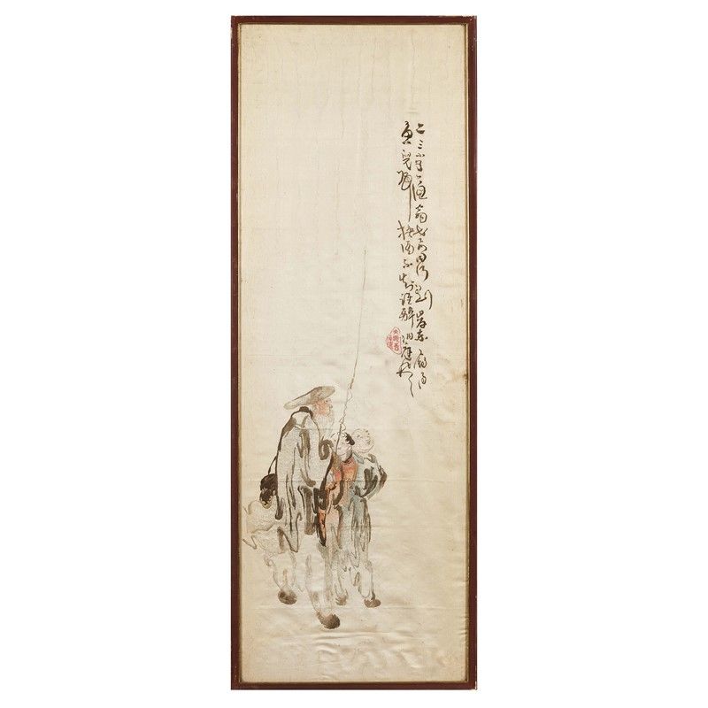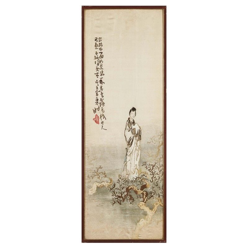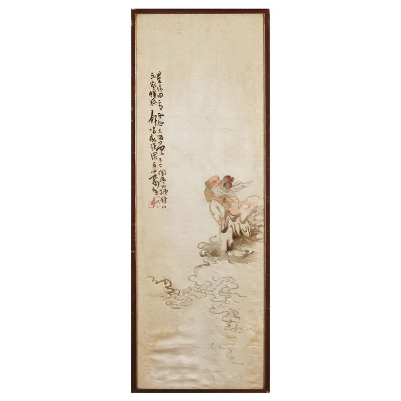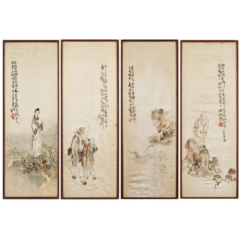 GRUPPO DI QUATTRO RICAMI, CINA, DINASTIA QING, SEC.XX su seta raffigurante personaggi con calligrafia e firma. A) raffigurazione di una nobildonna all’esterno. B) raffigurazione di un anziano e due bambini. C) raffigurazione di una divinità Shou, una delle tre stelle. D) raffigurazione dei quattro saggi anziani. Dim.cm 35x102 清 二十世纪 人物故事纹绣一组四件 绢本刺绣 尺幅35x102厘米