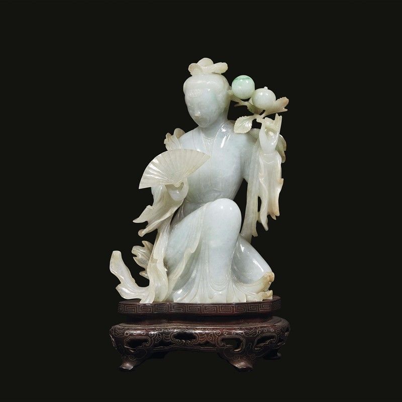 in giadeite color verde mela e viola lavanda che ritrae una figura femminile con ventaglio e frutta nelle mani.