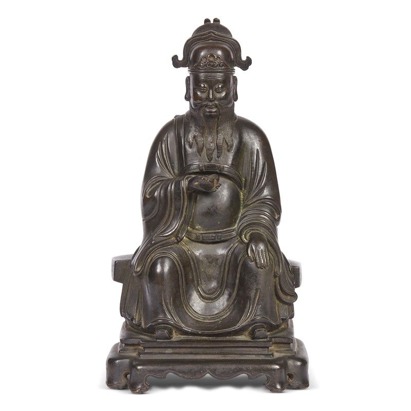 in bronzo brunito che ritrae Caishen (la divinità che porta ricchezza) seduto. Nella mano destra tiene Yuanbao 元宝.