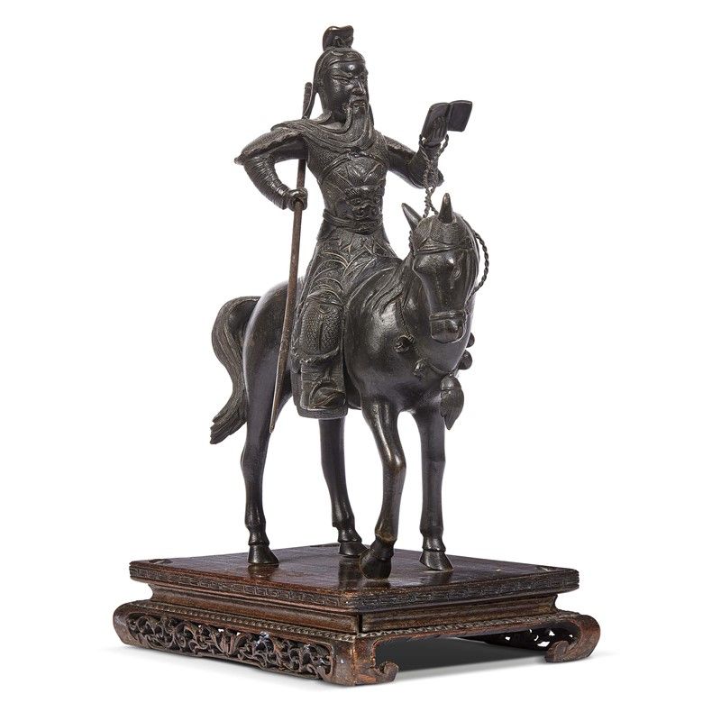 in bronzo brunito fissata su di una base in legno (non pertinente) raffigurante Guan Yu a cavallo. Con la mano sinistra regge un libro, mentre con la mano destra tiene una lancia (in rame?) probabilmente non pertinente.