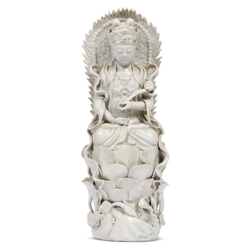 in porcellana bianca Dehua raffigurante guanyin seduta sulla base di fiore e foglie di loto.