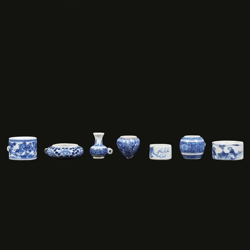 in porcellana bianco blu, di cui uno con decoro di bestia, quattro con decori floreali, uno con scena cerimoniale e uno a forma Chang Ping con decori floreali.