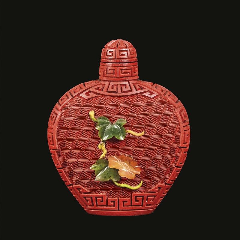 清 十九至二十世纪 剔红嵌宝鼻烟壶 高7,4厘米