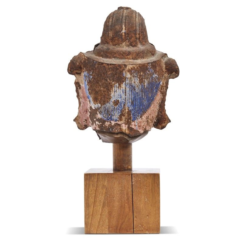 TESTA DI BUDDHA, CINA, DINASTIA YUAN-MING, SEC.XIII-XIV in ferro, con tracce di colore blu e rosa sulla superficie posteriore del capo. Viso raffigurante Bodhisattva. Gli occhi sono leggermente aperti e clementi. Il profilo tra il sopracciglio e il naso ha lineamenti continui, legati tra di loro. Le guance sono tonde e la bocca sinuosa. I lobi delle orecchie sono allungati e tondeggianti. Probabilmente il soggetto indossava una corona e parte della sua decorazione è rimasta visibile appena al di sopra delle orecchie. La sua capigliatura è ordinata ed è parzialmente raccolta nel copricapo sovrastante. Alt.cm senza base 27 元明 十三至十四世纪 铁胎佛首 不含底座净高27厘米