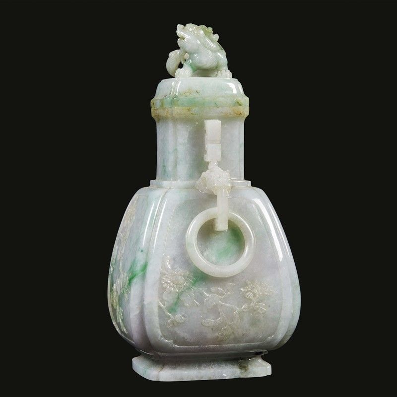VASO, CINA, DINASTIA QING, SEC.XIX-XX in giadeite di colore mela verde e bianco a forma squadrata di Hu ad anse a forma di testa di Chilong con anello decorato con motivi Hui, le pareti incise con fiori e volatili, la presa di coperchio raffigurante un leone. Alt.cm 20 清 十九至二十世纪 翡翠狮钮活环尊 高20厘米