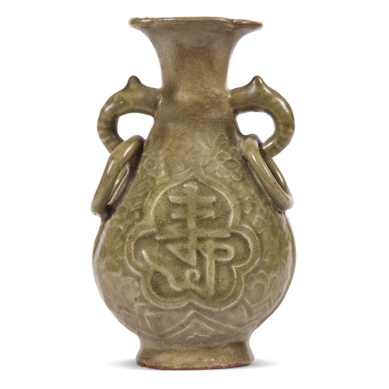 in porcellana celadon Longquan, anse con anelli decorati con calligrafia Shou (lungavita) a rilievo.