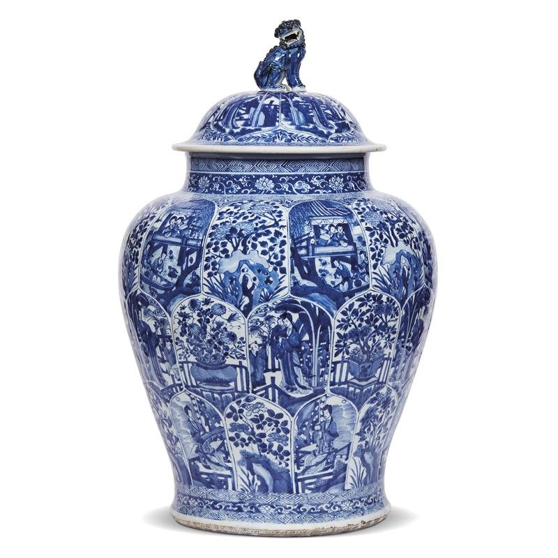 VASO, CINA, DINASTIA QING, SEC.XVIII in porcellana bianco e blu, il coperchio con presa a forma di leone. Presenta raffigurazioni di figure femminili e bambini, fiori con vasi entro le riserve a forma di petali fior loto. Alt.cm 60 清 十八世纪 青花仕女图将军罐 高60厘米