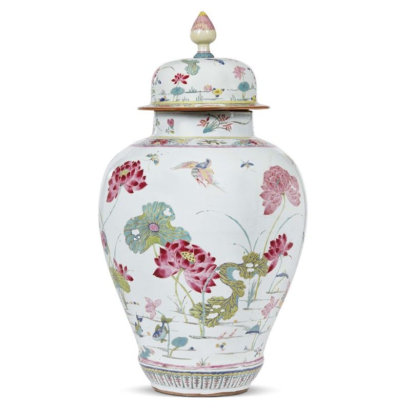 in porcellana policroma Famiglia Rosa a forma Jiangjunping decorato con fiori di loto ed uccellini.
