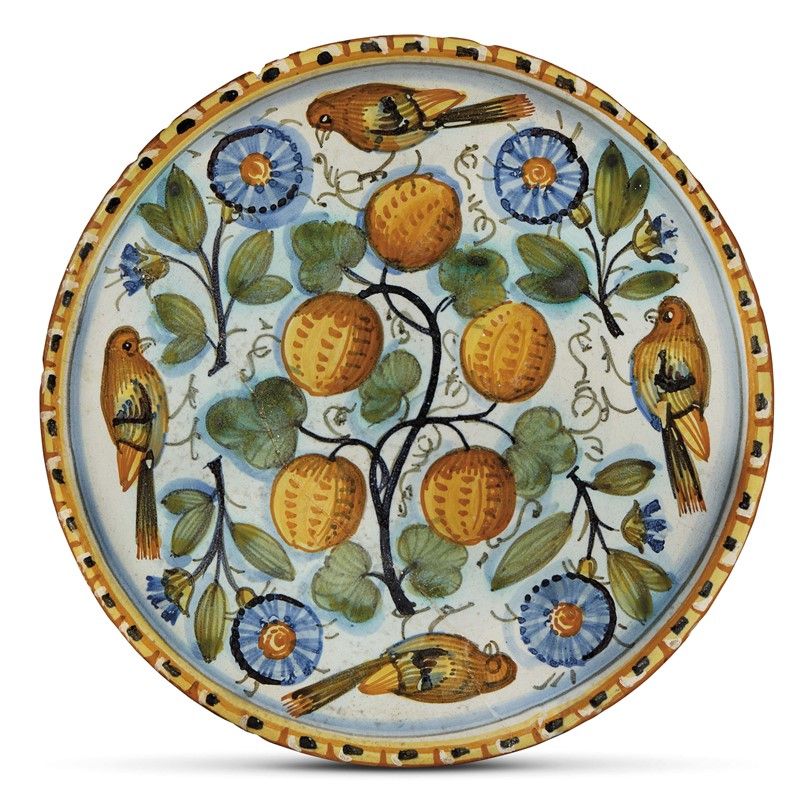in maiolica dipinta in policromia, poggiante su base alta applicata a crudo, di forma piana con l’orlo appena rilevato. L’intera superficie del fronte è decorata con il motivo a fruttini e uccelli, mentre al verso sono presenti righe concentriche giallo e blu. L’ornato è raro e trova precisi riscontri in opere del Museo Medievale di Bologna, tra cui un vassoio ovale e una coppa da malato con decoro analogo; diam. cm 21,4, diam. piede cm 8, alt. cm 3,3