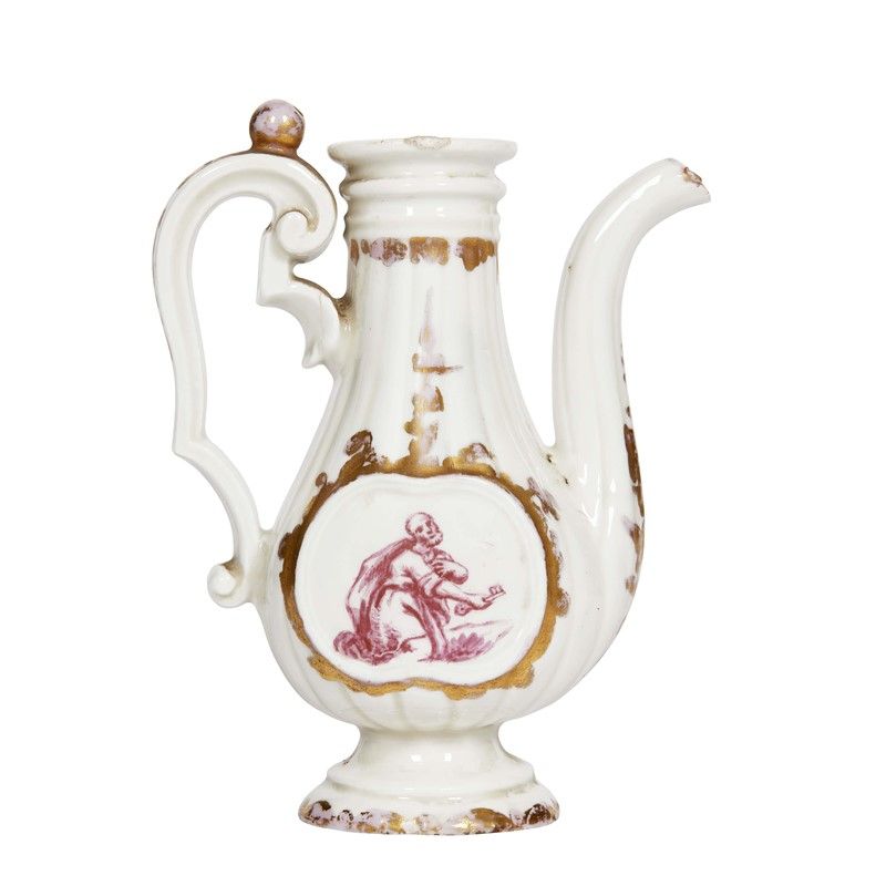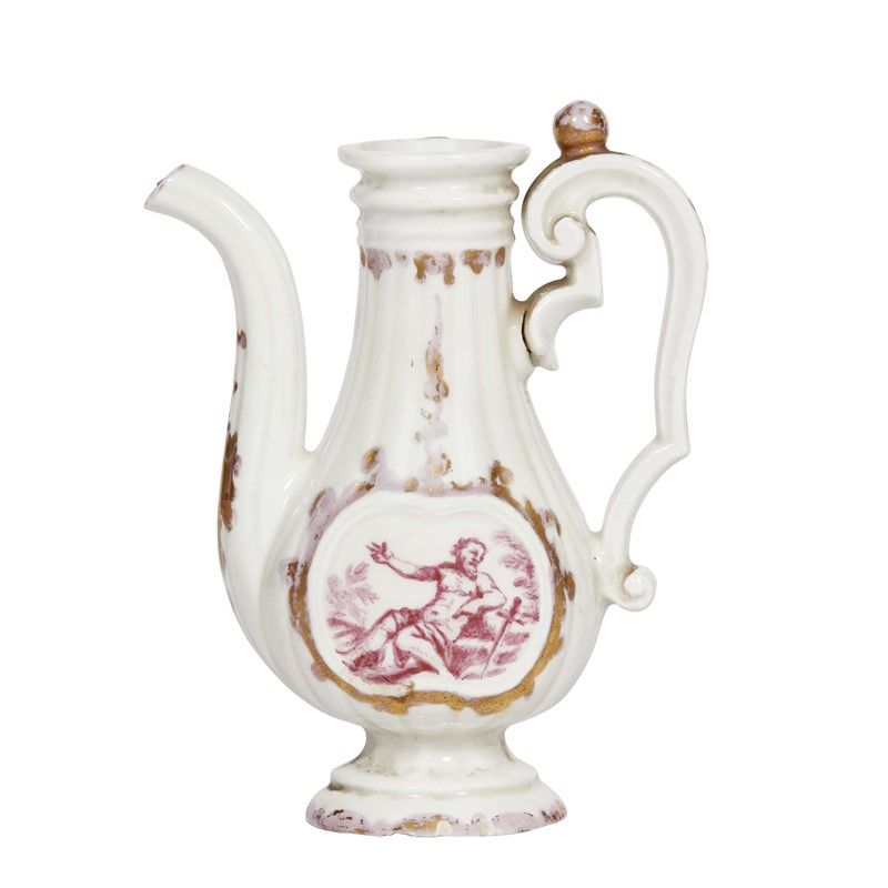 in porcellana decorata in monocromia porpora e oro; corpo piriforme schiacciato ai lati e sagomato secondo un modello ricavato dall’argenteria, poggiante su un alto piede, grande ansa mistilinea e cannello alto e arcuato. Il decoro, sulle due facce, mostra la raffigurazione di San Pietro e San Paolo entro cronice sagomata; alt. cm 13,5