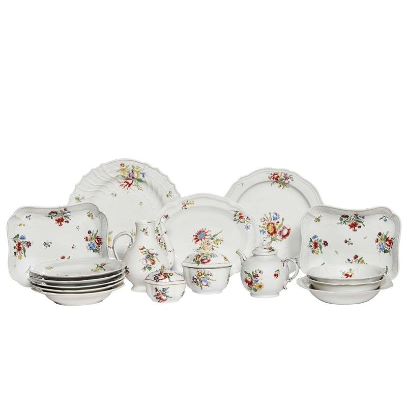 in porcellana dipinta in policromia, con il tipico decoro costituito da mazzetti floreali delineati sulla superficie. Composto da 5 piatti piani, piatto fondo, piatto grande, vassoio circolare costolato, 2 vassoietti rettangolari, vassoio ovale, 2 ciotole, caffettiera, teiera e due zuccheriere diverse