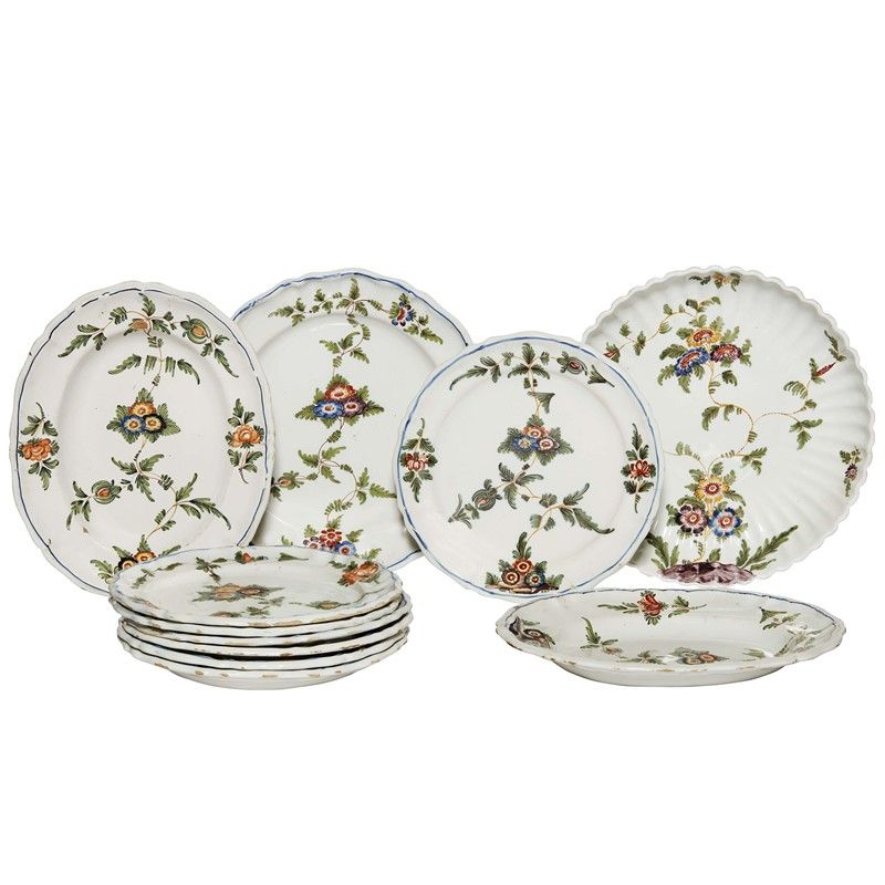 in maiolica dipinta in policromia secondo il motivo decorativo “a blanser”, caratterizzato da una base rocciosa su cui poggiano tra piccoli fiori e dalla quale parte uno stelo sottile e sinuoso che va a riempire quasi l’intera superficie con una triade di fiori e numerosi tralci fogliati. Composto da 6 piatti (diam. cm 24), 2 vassoi ovali (cm 23,2x28,5), vassoio circolare (diam. cm 27,8), vassoio circolare costolato (diam. cm 29)