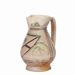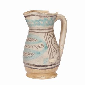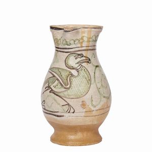 BOCCALE, FAENZA O ROMAGNA, SECOLO XIV in maiolica dipinta in verde ramina e manganese, corpo piriforme su basso [..]
