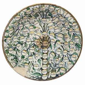 PIATTO DA POMPA, ALTO LAZIO, 1578 in maiolica dipinta in policromia, con cavetto profondo e largo, tesa breve [..]