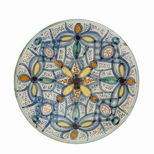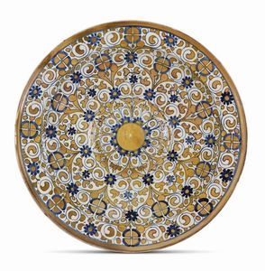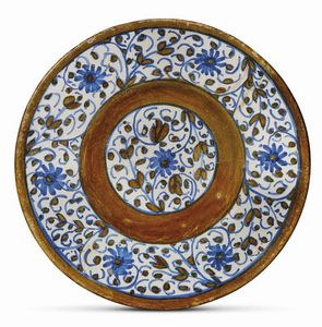 GRANDE PIATTO UMBONATO, SIVIGLIA, PRIMA METÀ SECOLO XVI in maiolica decorata a lustro metallico e in blu, [..]