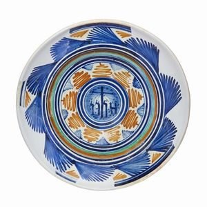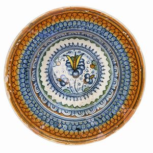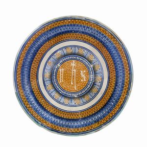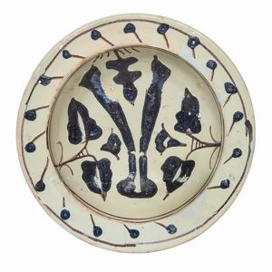 CIOTOLA, SIENA (?), INIZIO SECOLO XV In maiolica decorata a zaffera, forma concava tesa piana, poggiante su basso [..]
