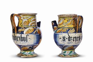 COPPIA DI ORCIOLI, AREA METAURENSE, PESARO, 1580 CIRCA in maiolica dipinta in policromia, corpo piriforme largo [..]