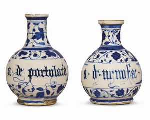 COPPIA DI BOTTIGLIE, VENEZIA, SECOLO XVI in maiolica dipinta in monocromia blu di cobalto, corpo globulare con [..]