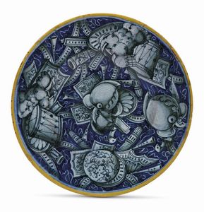 PIATTO DA POMPA, DERUTA, PRIMO TERZO SECOLO XVI in maiolica dipinta in blu cobalto e lustro metallico dorato, [..]