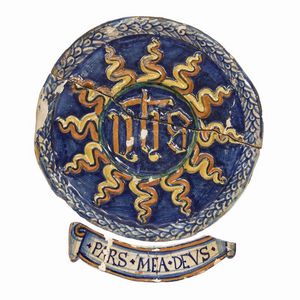 TARGA, DERUTA, SECOLO XVI in maiolica dipinta in policromia di foggia circolare con decoro rilevato, raffigurante [..]